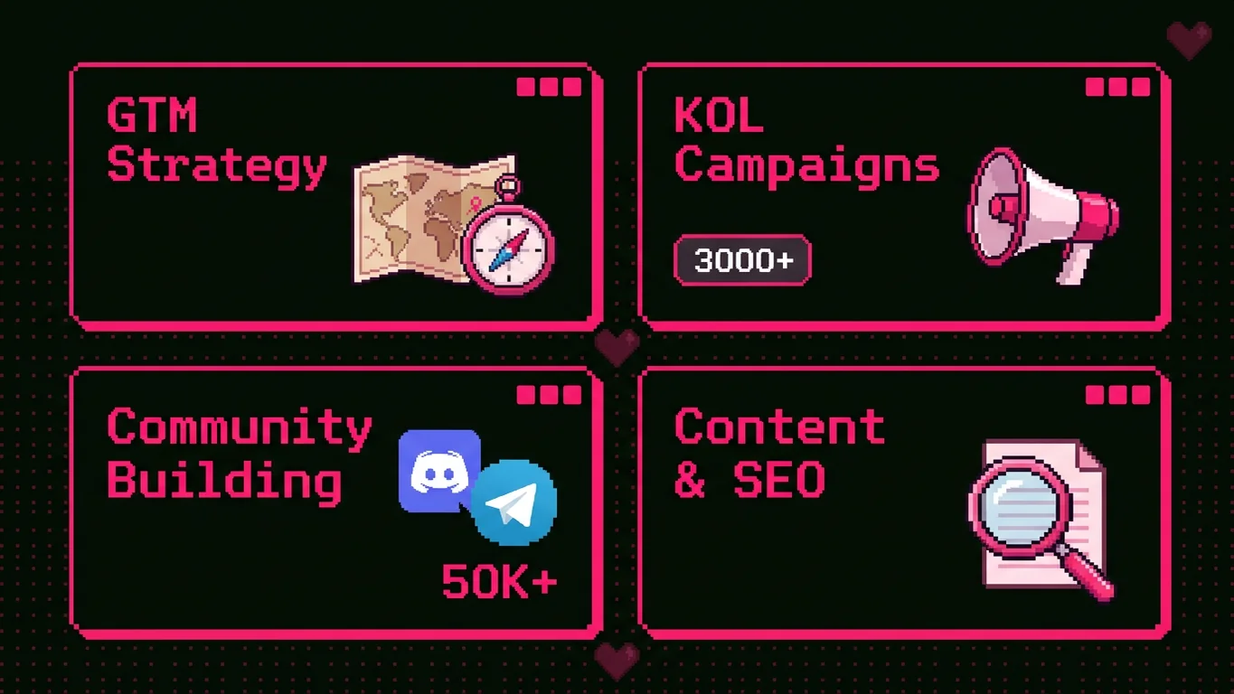 Full-service blockchain marketing agency delivering end-to-end growth strategies for Layer 1s, Layer 2s, DeFi protocols, and token launches. 3000+ KOL network, proven playbooks.