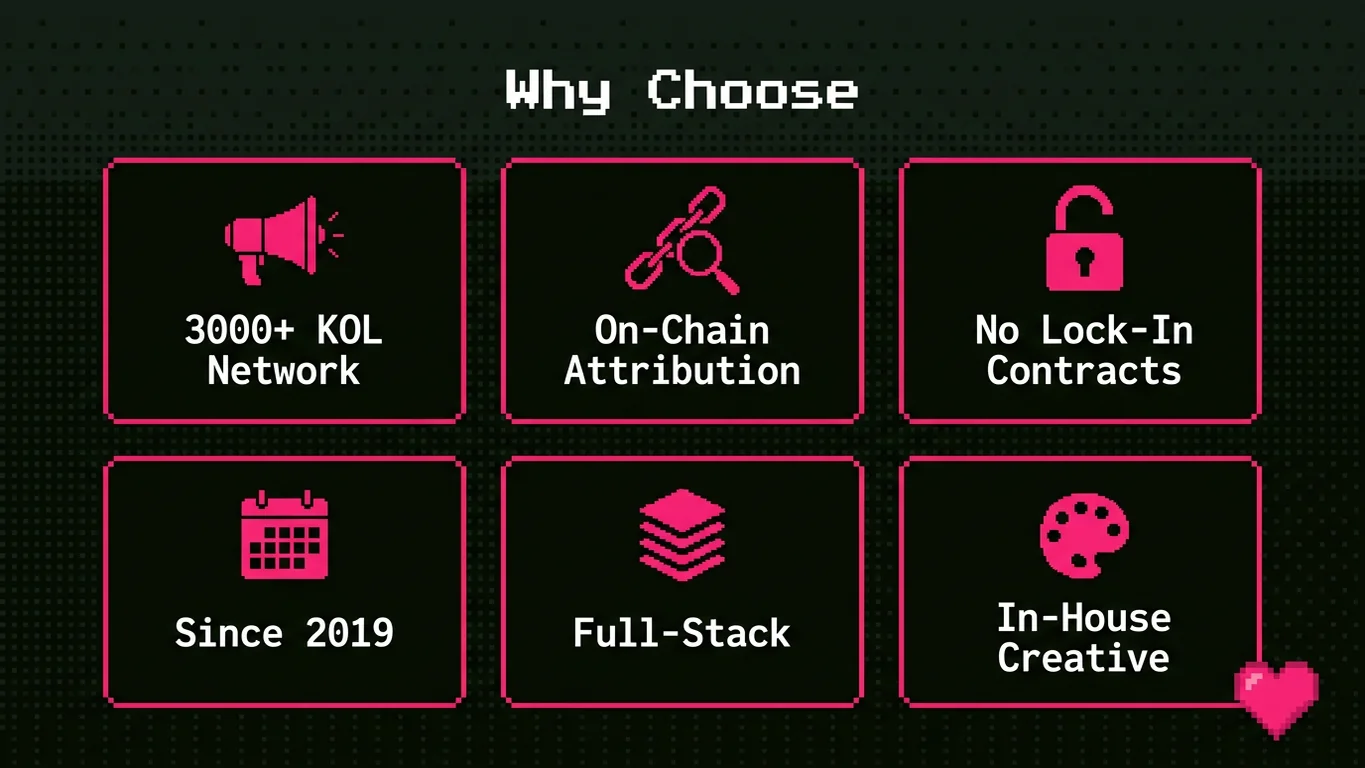 KOL & Influencer Marketing: Access our network of 3,000+ vetted crypto influencers across YouTube, X/Twitter, and Telegram. We handle campaign strategy, creator selection, content briefs, performance tracking, and on-chain attribution.