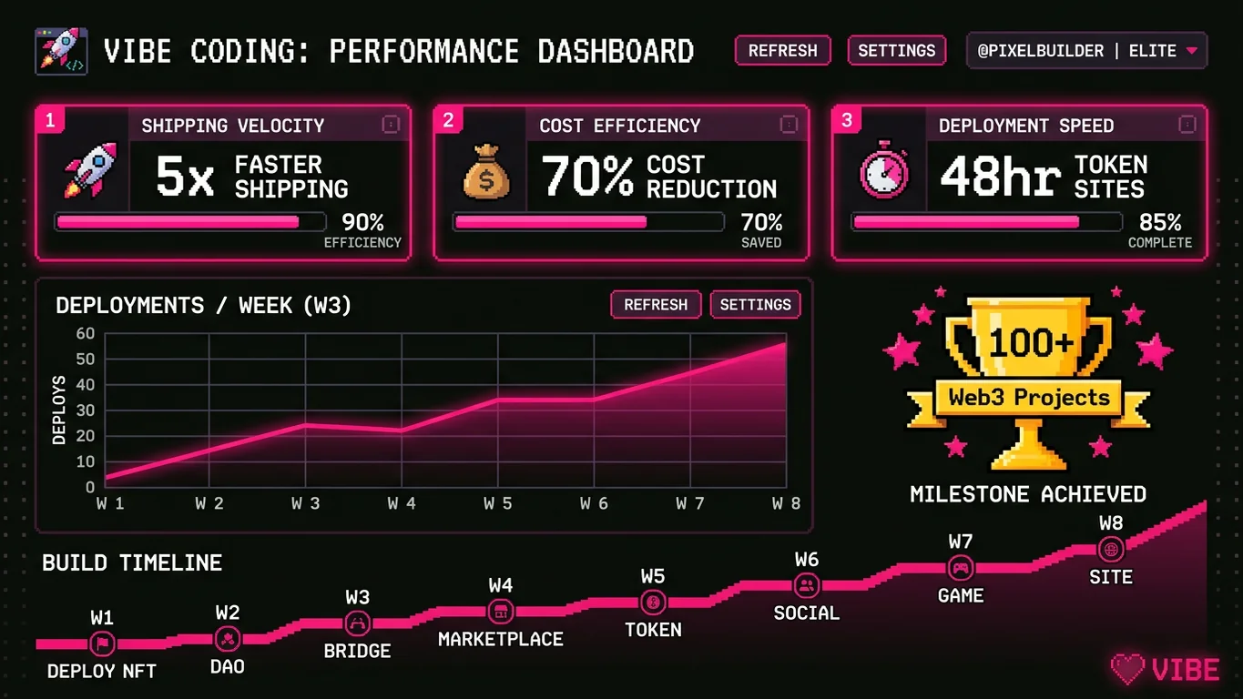 Vibe coding is an AI-accelerated development approach where developers use AI tools (like Cursor, Copilot, and Claude) to write code faster while maintaining creative direction and quality control. For crypto projects, this means shipping production-ready Web3 products in days instead of months.