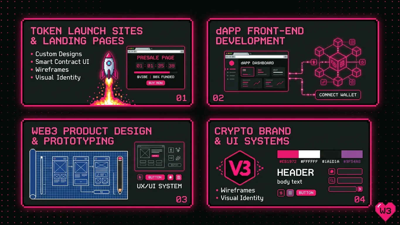 Blockchain branding agency creating distinctive brand identities for crypto projects. From visual systems to narrative positioning, we build brands that stand out in Web3.