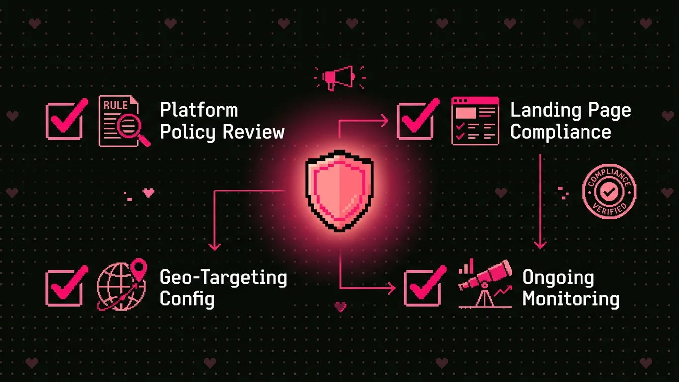 Our compliance process includes pre-launch creative review against platform-specific policies, landing page optimization for approval requirements, geo-targeting configuration for restricted jurisdictions, and ongoing monitoring for policy changes that could affect active campaigns.