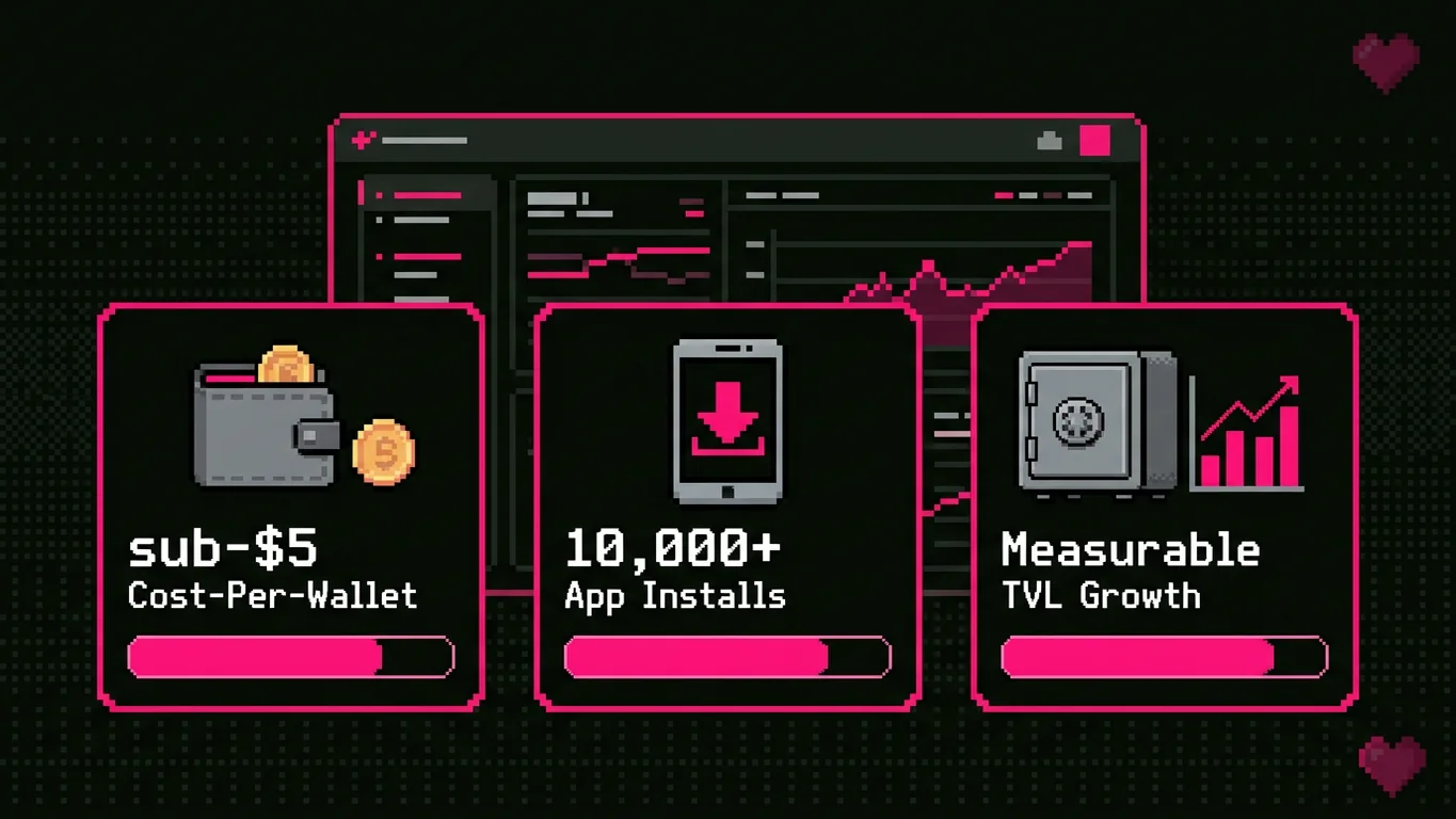 Our blockchain advertising campaigns are measured by cost-per-wallet-connection, cost-per-transaction, and cost-per-holder — not just clicks and impressions. We have achieved sub-$5 cost-per-wallet-connection for DeFi protocols, generated 10,000+ app installs for crypto wallets at below-industry CPAs, and driven measurable TVL growth through targeted ad campaigns.