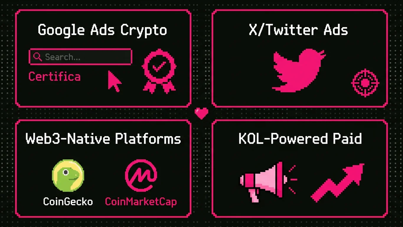 Web3-Native Platforms: Advertising across crypto-endemic platforms including CoinGecko, CoinMarketCap, DeFi Llama, and blockchain-specific ad networks that reach users with verified on-chain activity.