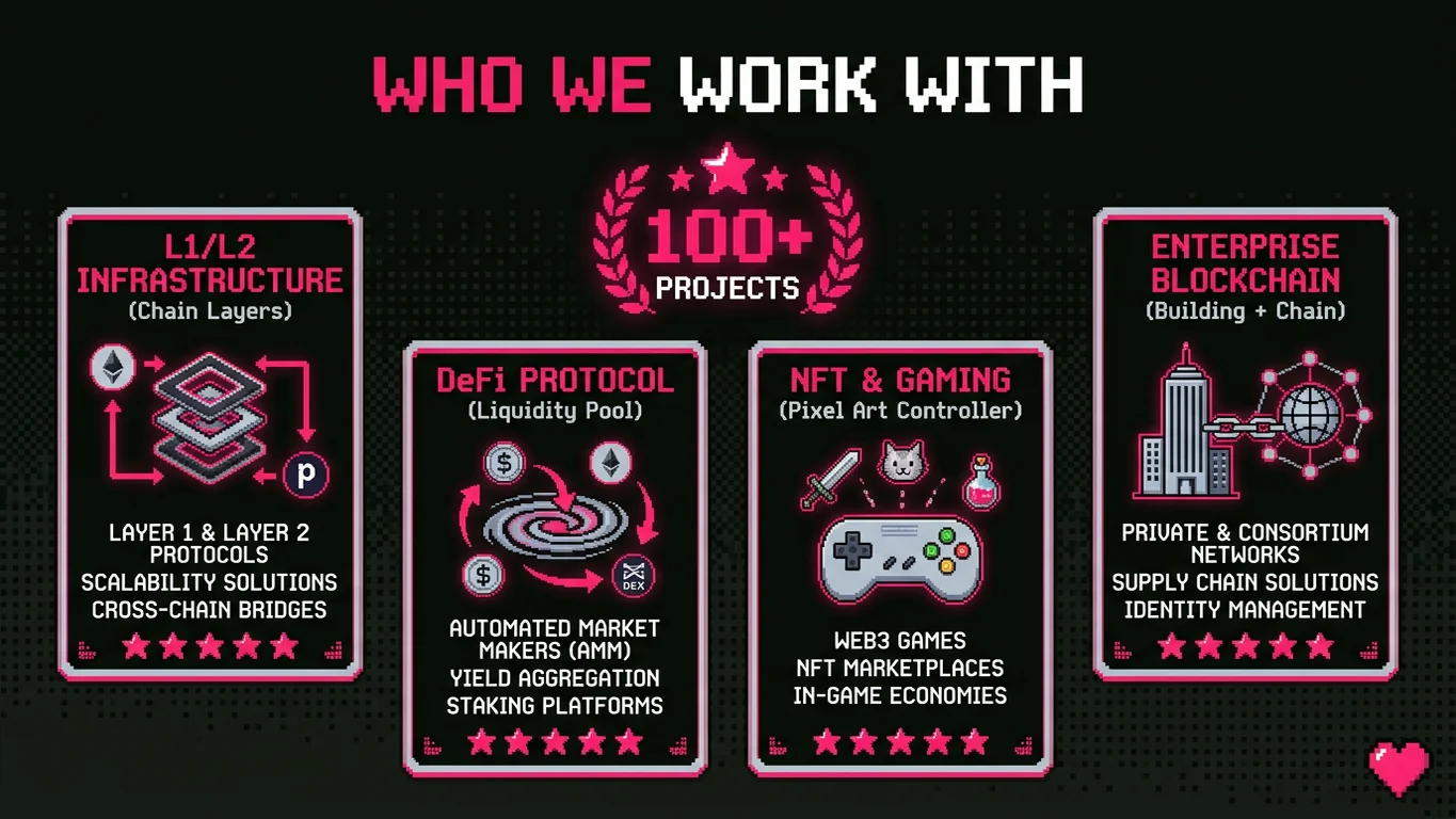 We work with L1/L2 networks, DeFi protocols, NFT platforms, infrastructure providers, DAOs, and blockchain gaming projects. Our team has deep expertise across the entire Web3 stack, from consensus mechanisms to user-facing dApps.