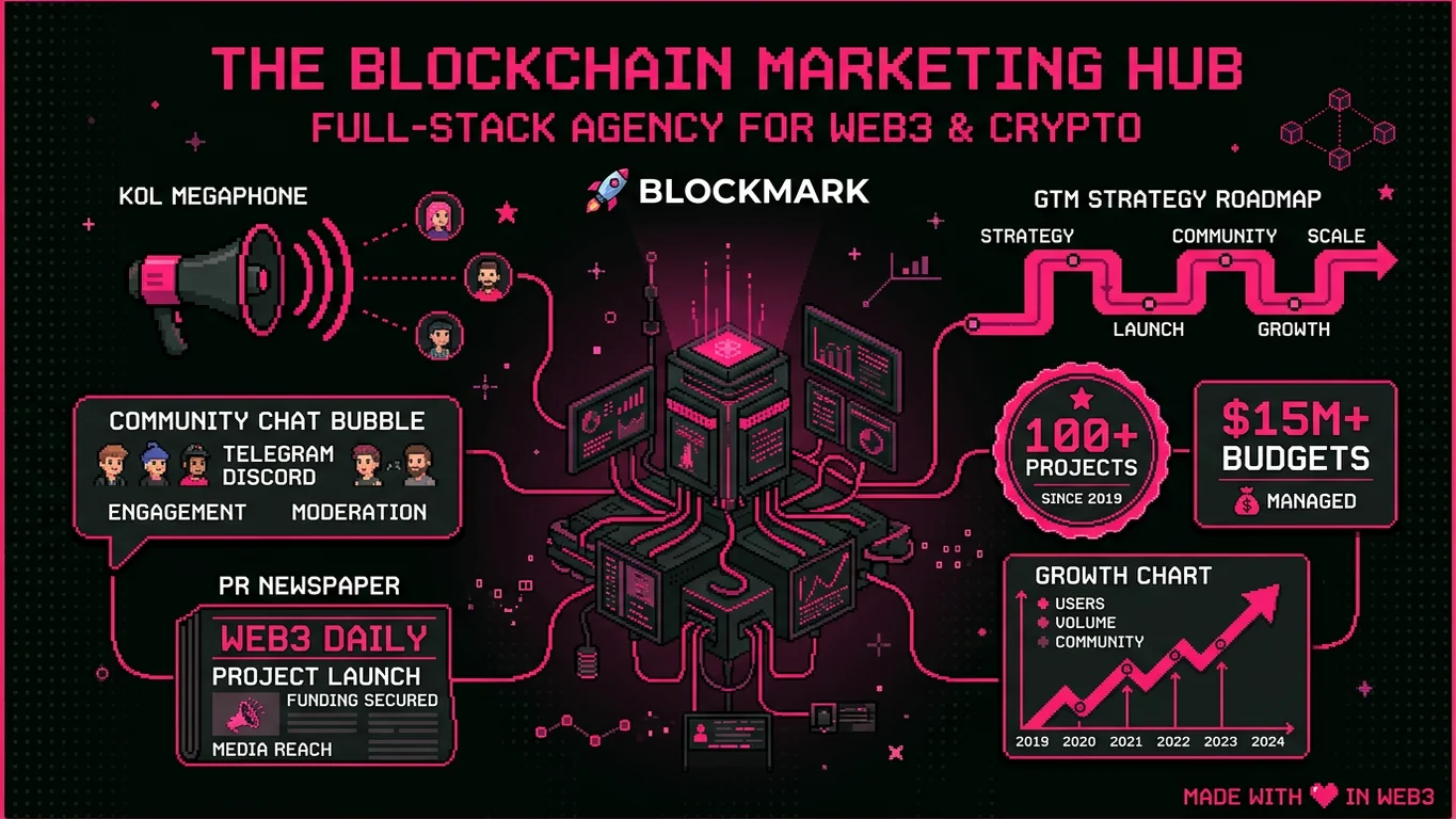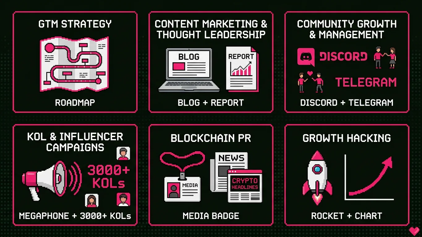 Full-service blockchain marketing agency delivering end-to-end growth strategies for Layer 1s, Layer 2s, DeFi protocols, and token launches. 3000+ KOL network, proven playbooks.