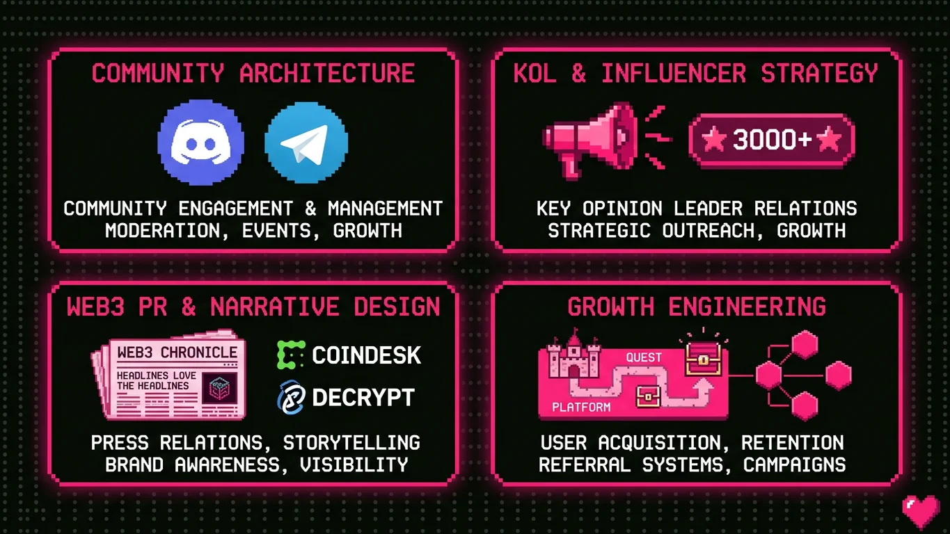 - Full-Stack Execution — One team for community, KOLs, PR, content, social, and paid